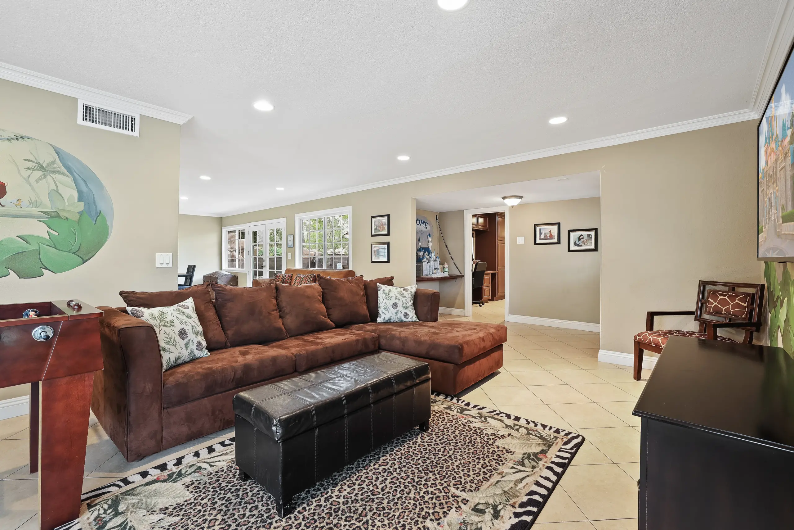 You'll discover hand-painted Disney-themed murals adorning every corner of the house; the kids’ rooms boast walls and ceilings completely adorned with these exquisite works of art. Your little ones can choose to slumber aboard Captain Hook’s Pirate Ship or under the sea with Ariel. Both kids’ bedrooms feature a secret “mouse hole” tucked away in the closets—send the youngsters on a thrilling quest to uncover them and claim the treasures within.